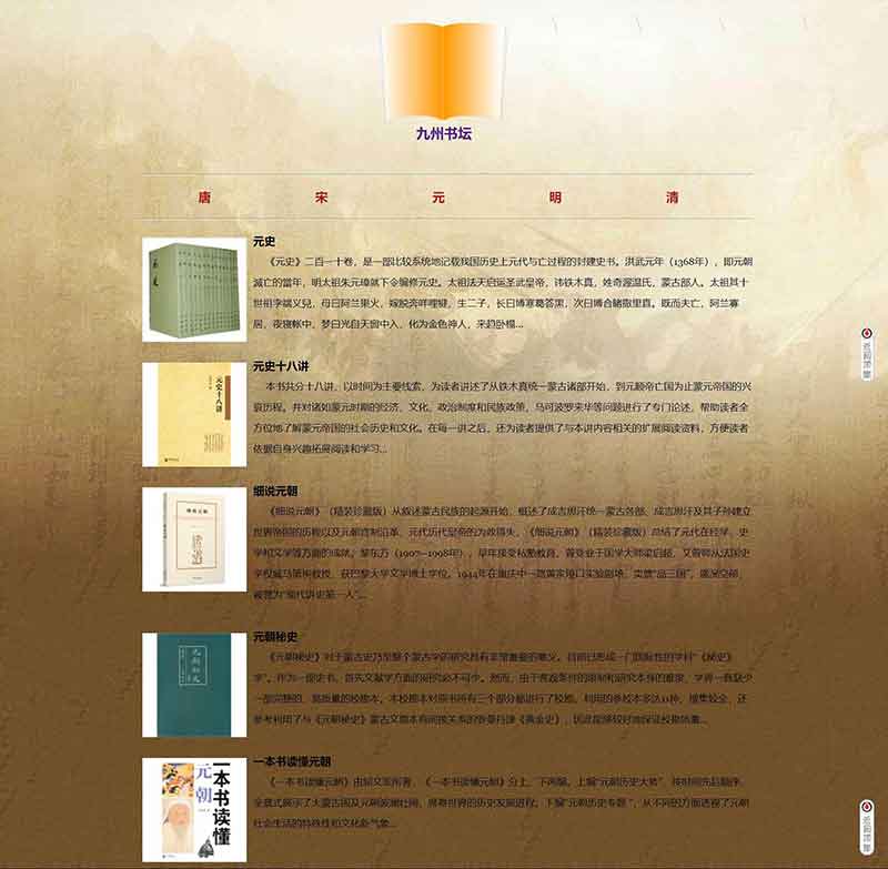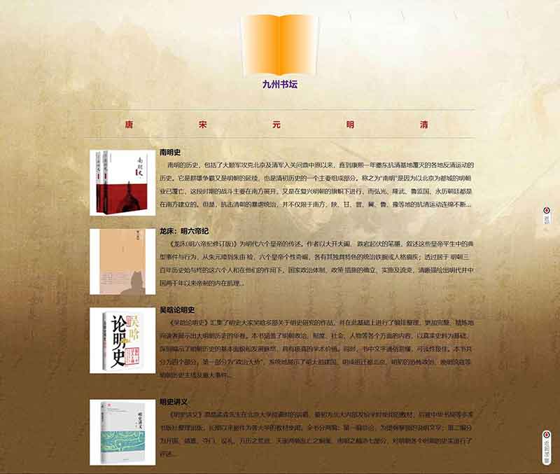 历史朝代书籍网页设计成品为大学生静态HTML网页课程水平成品,采用Table布局制作,共6个页面。技术知识点应用了:表单。